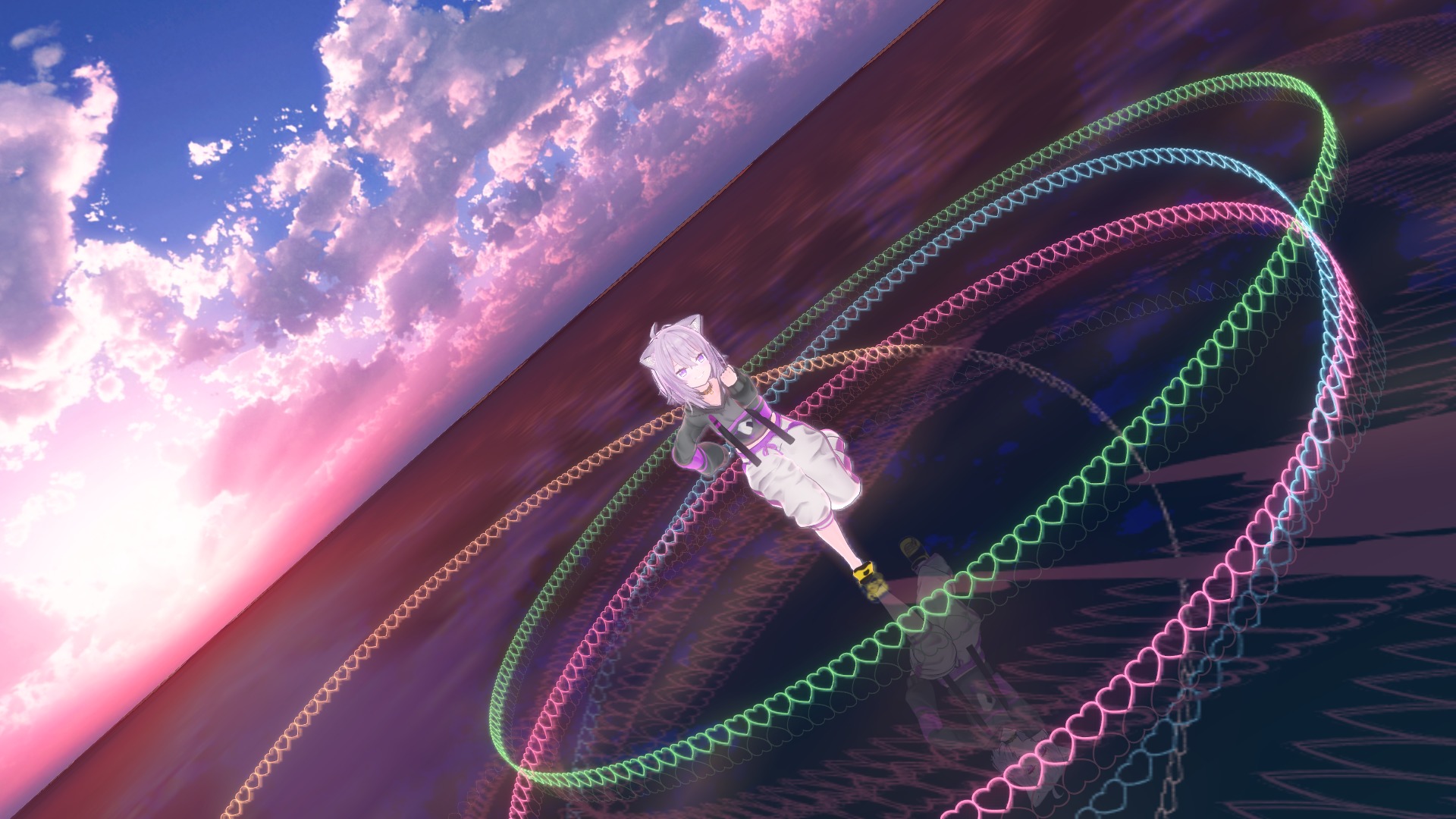 後からモデリングしたハート型チェーンをMMDステージに配置する際にPmxEditorを使用して発光させるための設定を行った。同様にキャラクターの目も発光するように設定した。キャラクターの向きの逆側に光源を設定しているので、それに合わせてキャラクターのアウトラインが発光するように専用のプラグインを組み込んだ。キャラクターが水面の上で踊っているように演出したかったので、地面が水面のように見えるプラグインを配置した。水面の高さに合わせてキャラクターの配置面の高さ調整を行った。
