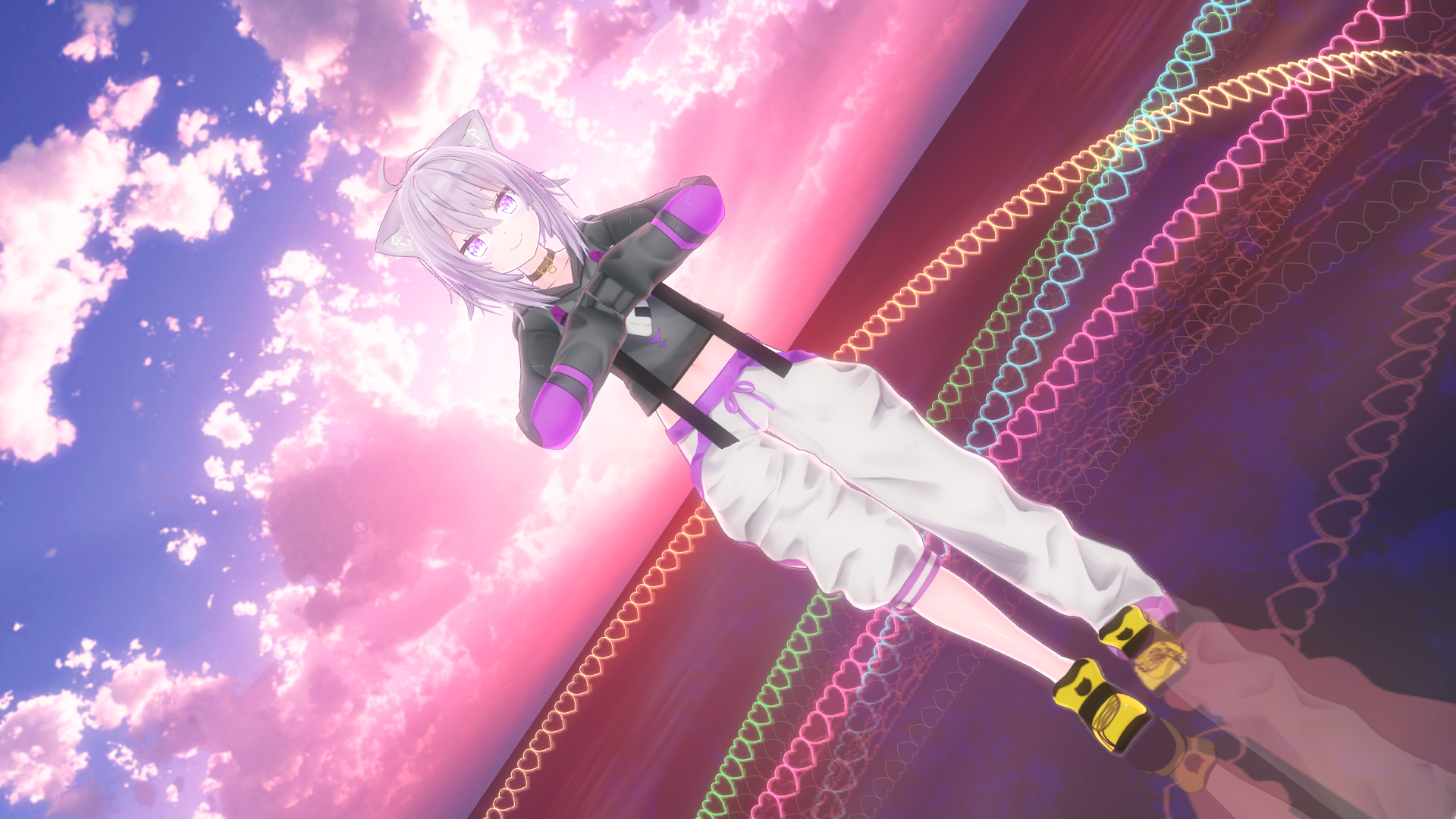 自作した部分はBlender 2.9によるハート型チェーンのモデリングとMMDの設定(設定箇所はカメラワークの調整と光源・色合いの設定のみ※3Dキャラクターとキャラクターモーション、カメラワーク、背景ステージ、音楽といくつかのプラグインはすでに配布されているものをお借りしました)