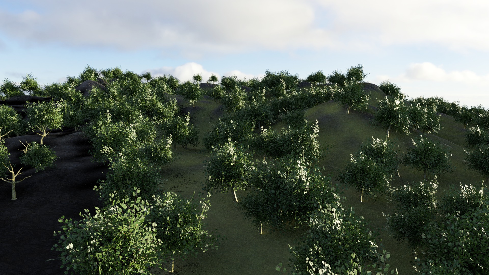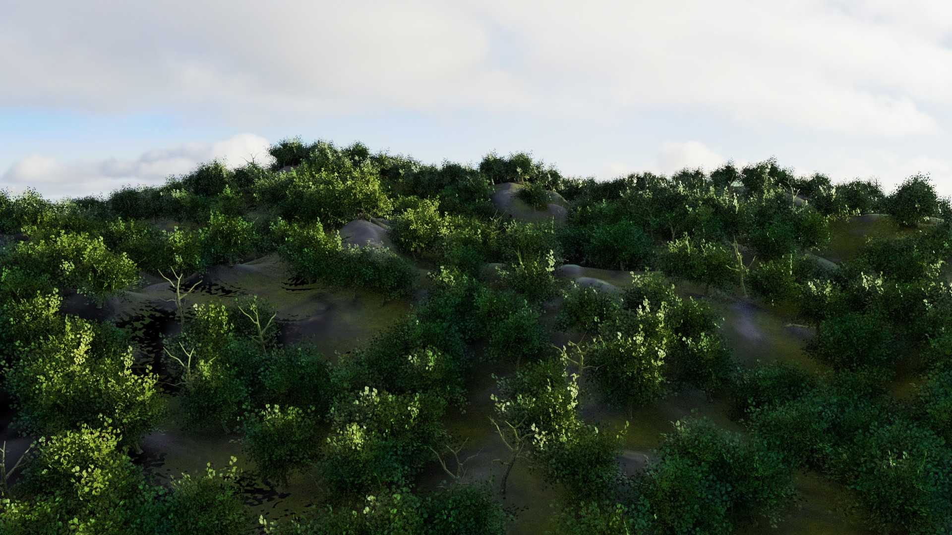 海外のアーティストが制作したチュートリアル動画を見ながらBlenderで森を作成した。以前Landscapeツールを使用して作成した岩山をベースにパーティクル(ヘアー)の設定を行い1500本の木を生やした。パーティクルには以前作成したローポリモデリングツリーを適用した。葉の生えた木だけではなく、10:1の割合でランダムに枯れ木も配置した。当初木を配置した際にパーティクルを設定した部分(枝葉の部分)がレンダリングに反映されず、原因を調べても解決策を見いだせず作業が中断してしまったものの、Blenderではパーティクルを生成した際にそのパーティクルの子パーティクルの設定が反映されない事がわかり、 ローポリモデリングツリー の枝葉のパーティクルをメッシュオブジェクトに変換して木の幹と結合することにより問題が解決できた。その際にはBlender のコミュニティー掲示板などで質問を投稿し、運よく回答してくれたクリエーターの方の助言によって問題が解決された。3DCGを独学で学ぶ上でコミュニティーの存在の重要性を実感した。