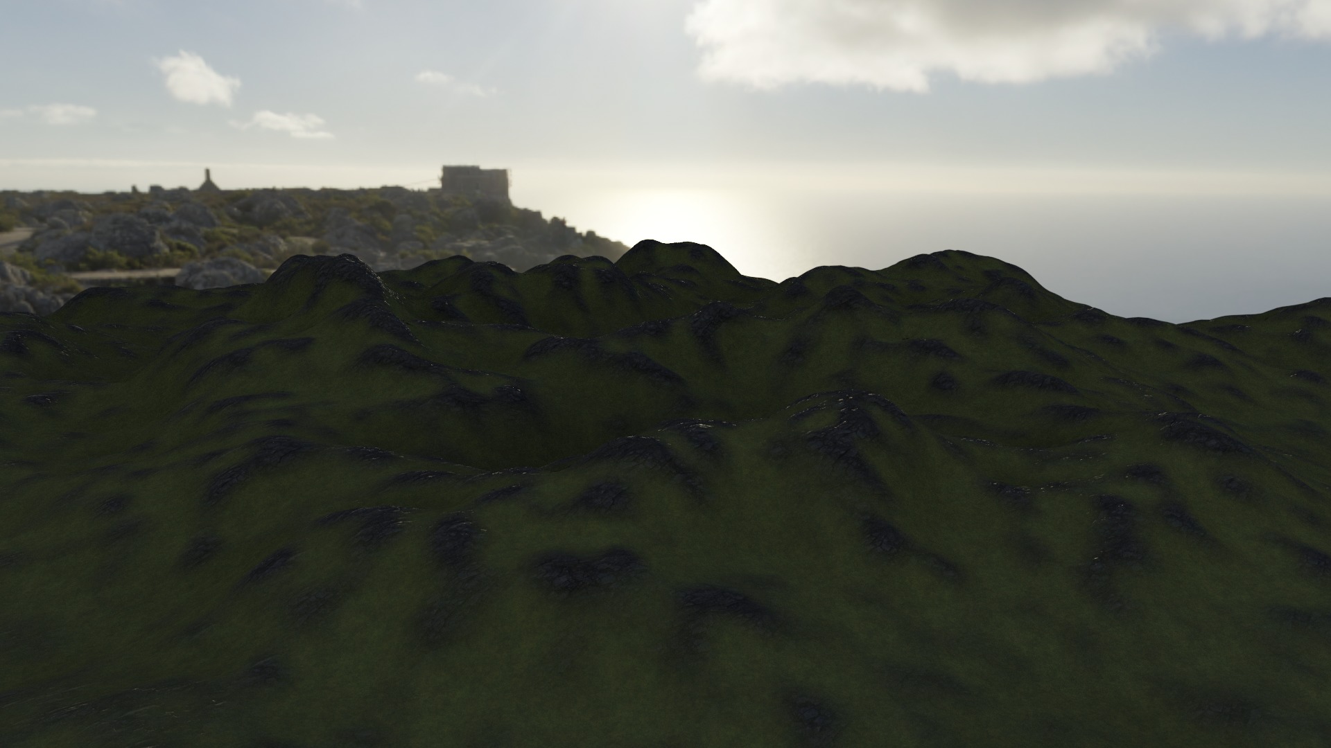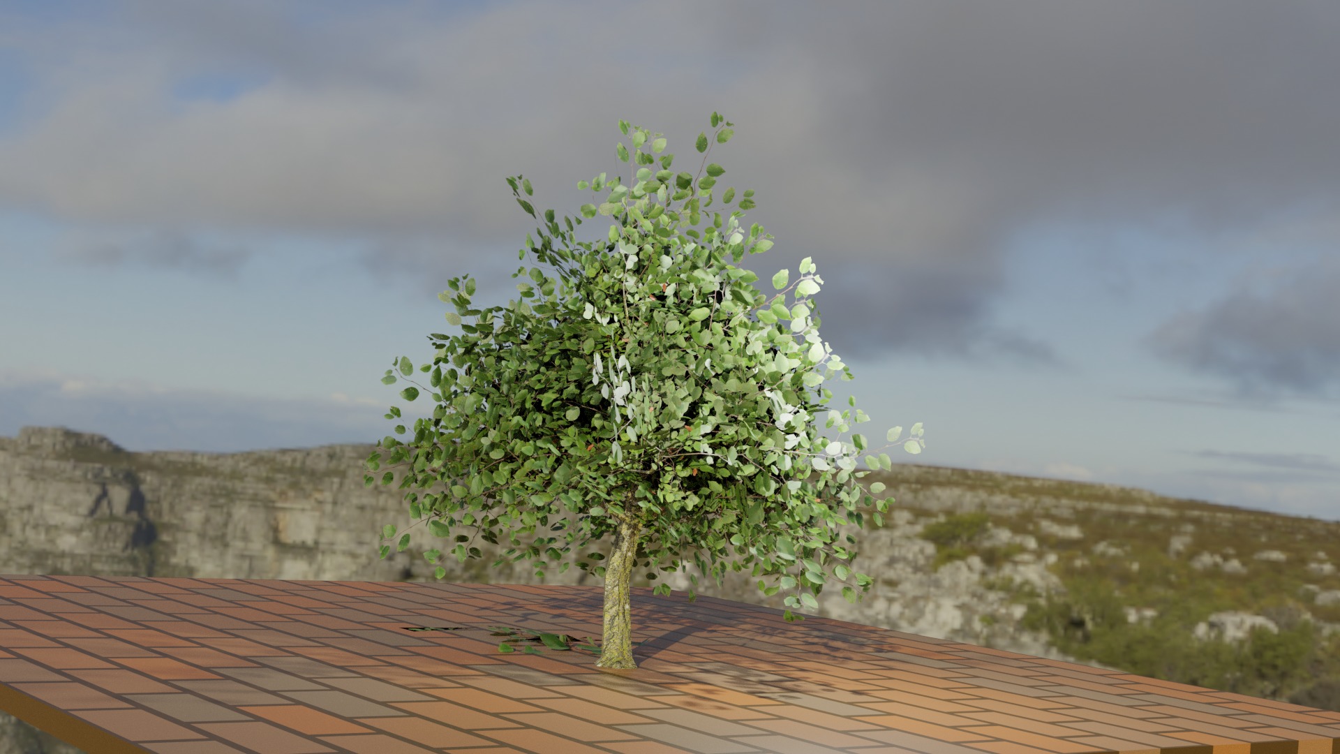 Landscapeというアドオンを使用してごつごつとした岩山とその上に生える苔を表現した。環境テクスチャ(Environment Texture)はフリーで配布されているものを使用。