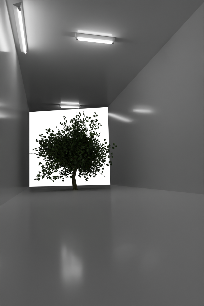建築パース作品にアップした地下鉄構内の3DCGモデリングの際に使用した3D空間座標のデータを元にローポリモデリングツリーを配置し、木以外の部分を透過させてレンダリングした画像と、木と影用に作成したメッシュだけレンダリングした画像と実物の地下鉄構内の写真を合成して制作した。元の地下鉄構内の画像に色味を合わせるためにPhotoshopで木の画像だけトーンカーブを調整して配置した。影の映し出された白いメッシュの画像は特に木の周辺の影だけを抽出して、写真になじむように加工した。