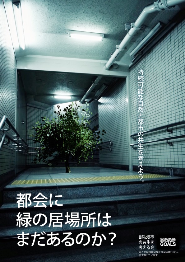SDGs啓発ポスターということで持続可能な自然と都市の共生をテーマに、現実には起こりえない地下鉄構内の床から木が生えている絵を見た人が違和感を感じると共に想像力を掻き立てられるようなコンセプトで画面を構成した。狭い都会の地下の片隅から窮屈そうに生える木の様子を通して都会における自然の居場所のなさを感じさせる様子からその絵にリンクするようなキャッチコピーを考えた。