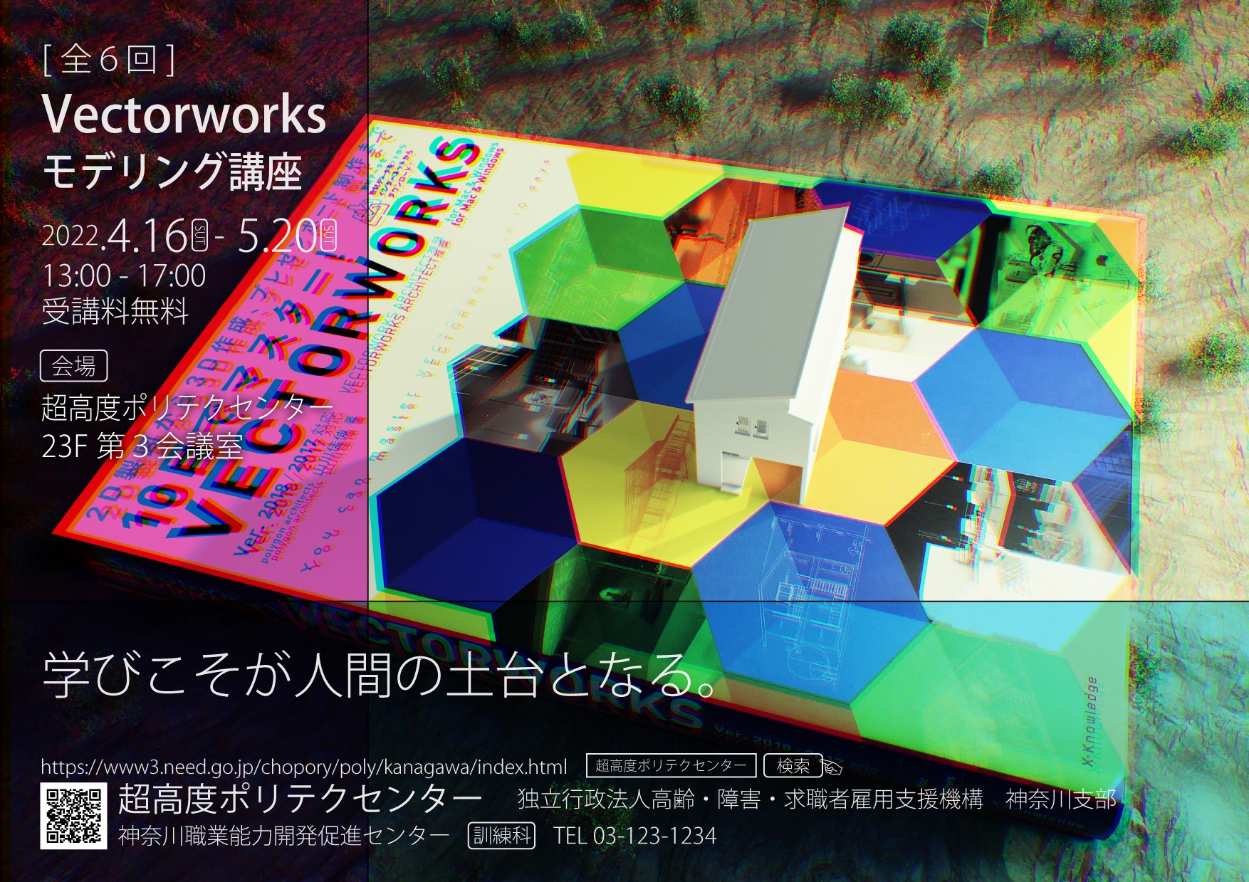作品説明:建築系3DCADソフトVectorworksを学ぶにあたってその覚悟と意気込みを3DCGに込めて表現してみた。今のところVectorworksを独学でしか学ぶあてがないもどかしさを架空の講座のチラシを作成する事で表現した。