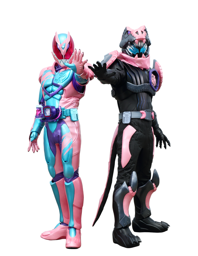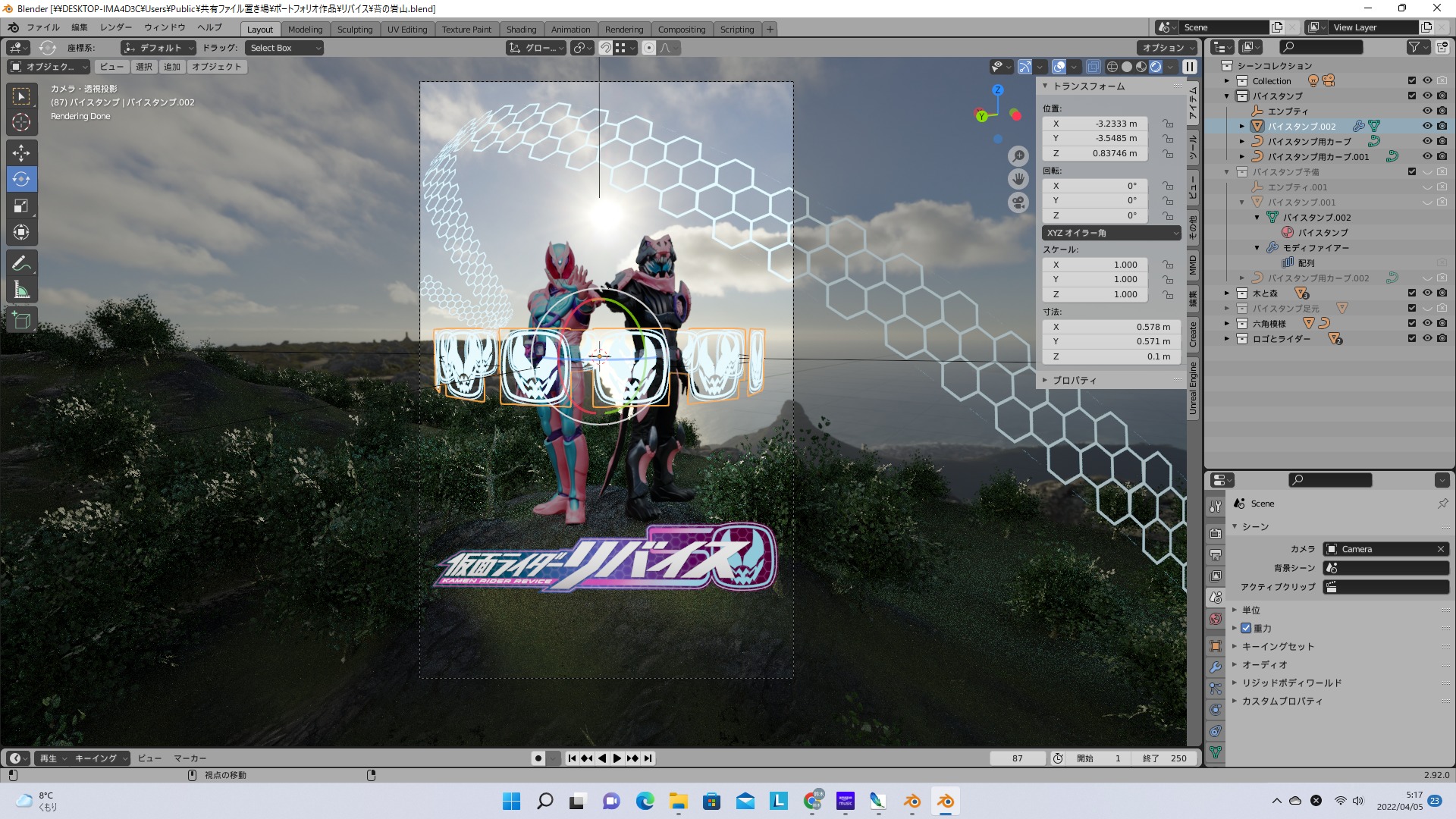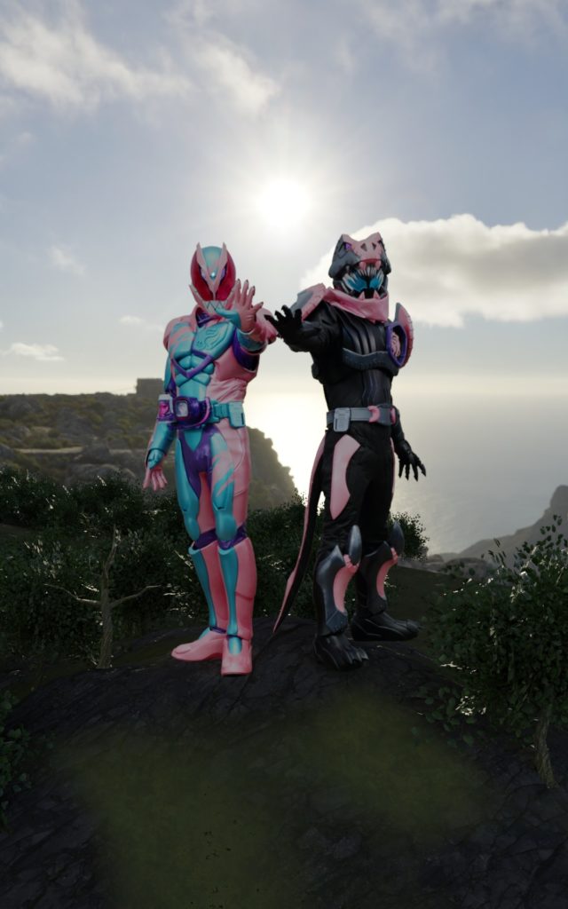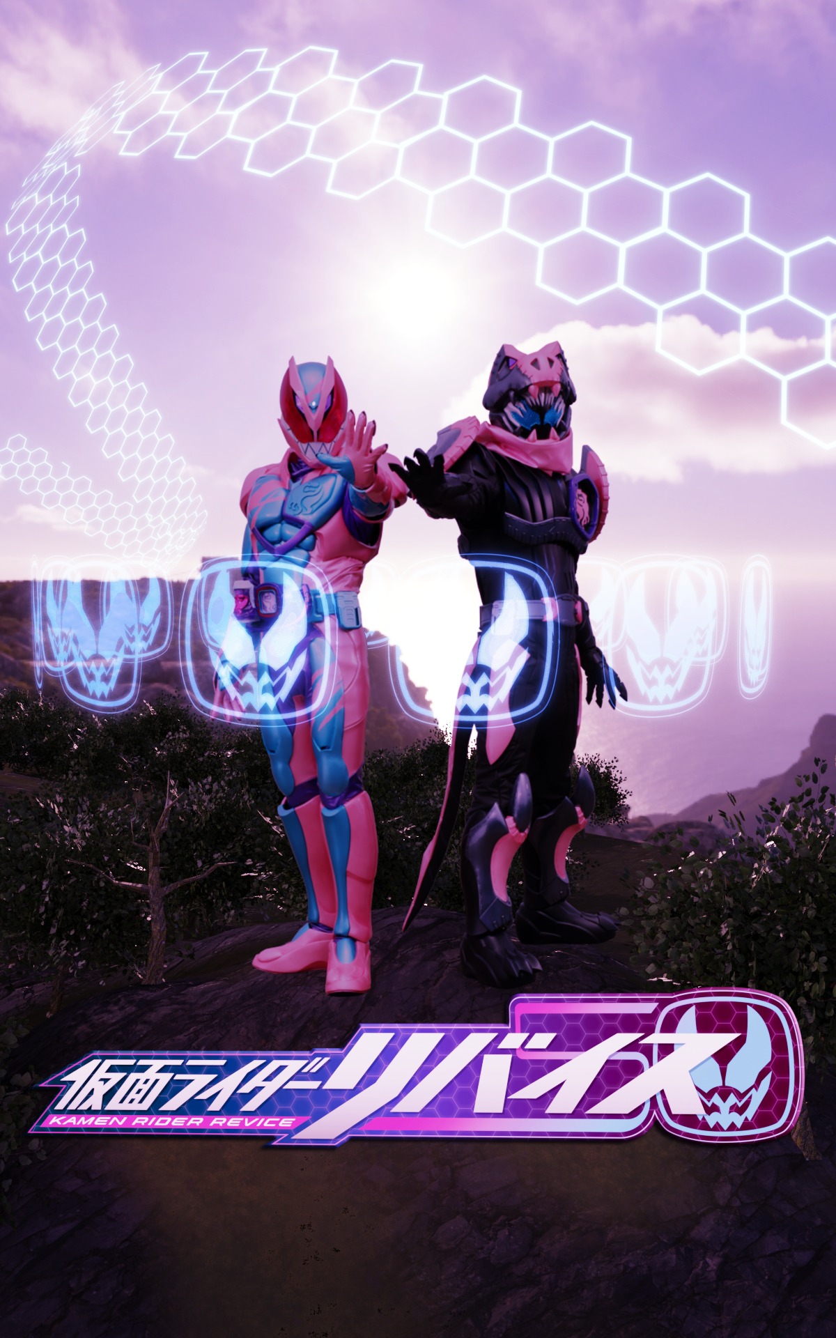 人物と3DCGの合成は初めてだったものの、なんとか人物を3DCGの空間になじませることができた。2022年度の仮面ライダー「仮面ライダーリバイス」のコンセプトカラーや使用されているモチーフを取り入れ画面を構成した。モチーフのバイスタンプ(リバイスの顔モチーフの図案)をillustratorでトレースして作成し、Blenderに取り込んで配列モディファイヤーを適用し、魔法のような効果を出した。六角形のモチーフのテクスチャも同様にillustratorで作成し、illustratorで作成したカーブに沿わせて配列させた。キャッチコピーは本編のドラマの内容から自分で考えた。