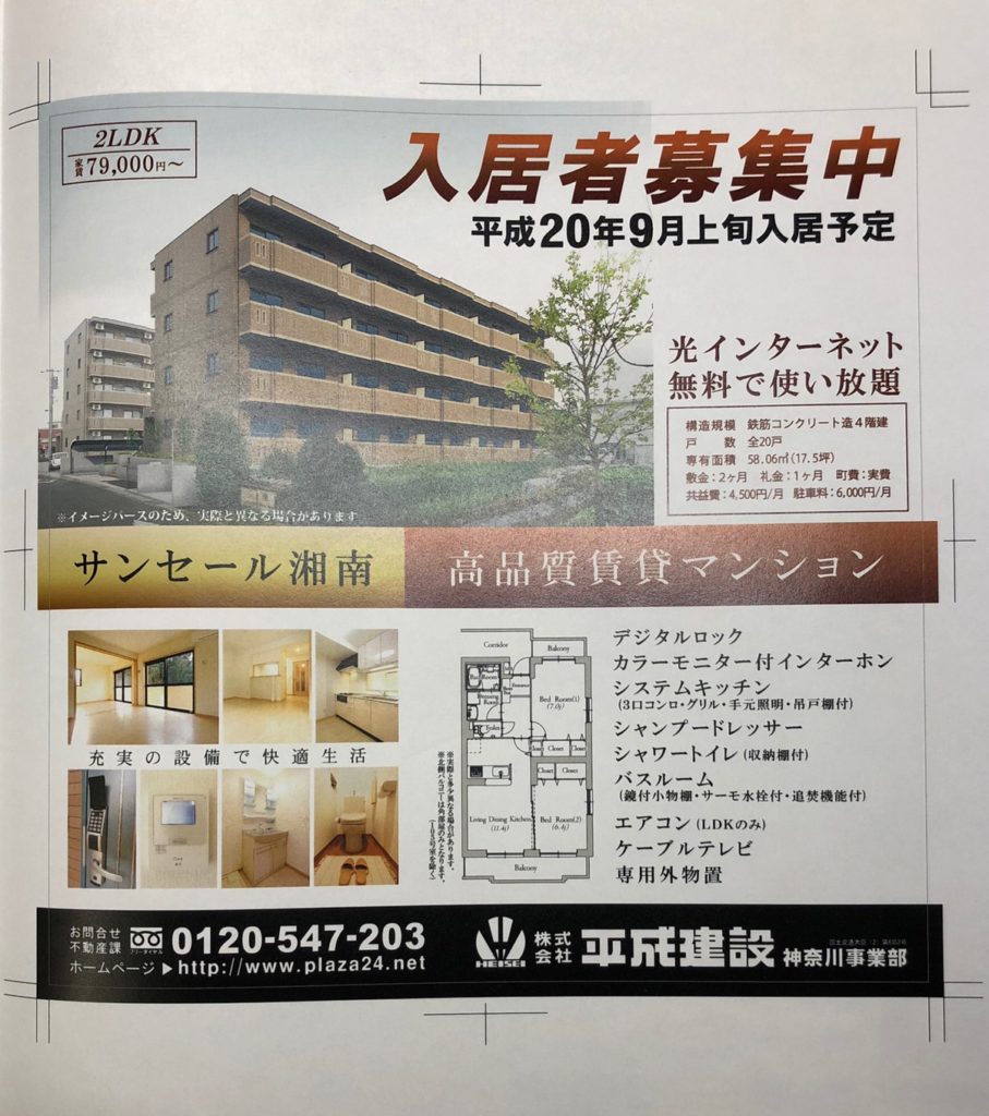 マンションの竣工予定に合わせて設計者と打ち合わせを行いながらマンションの設備や機能をピックアップし、広告のレイアウトを作成していった。マンションの内観は過去に自社で建設したマンションの中から当該物件の設備の規格に合う設備の写真をデータからピックアップして埋め込んだ。竣工後には再度実際の物件に出向き、内観の写真撮影からフォトレタッチもすべて行った。