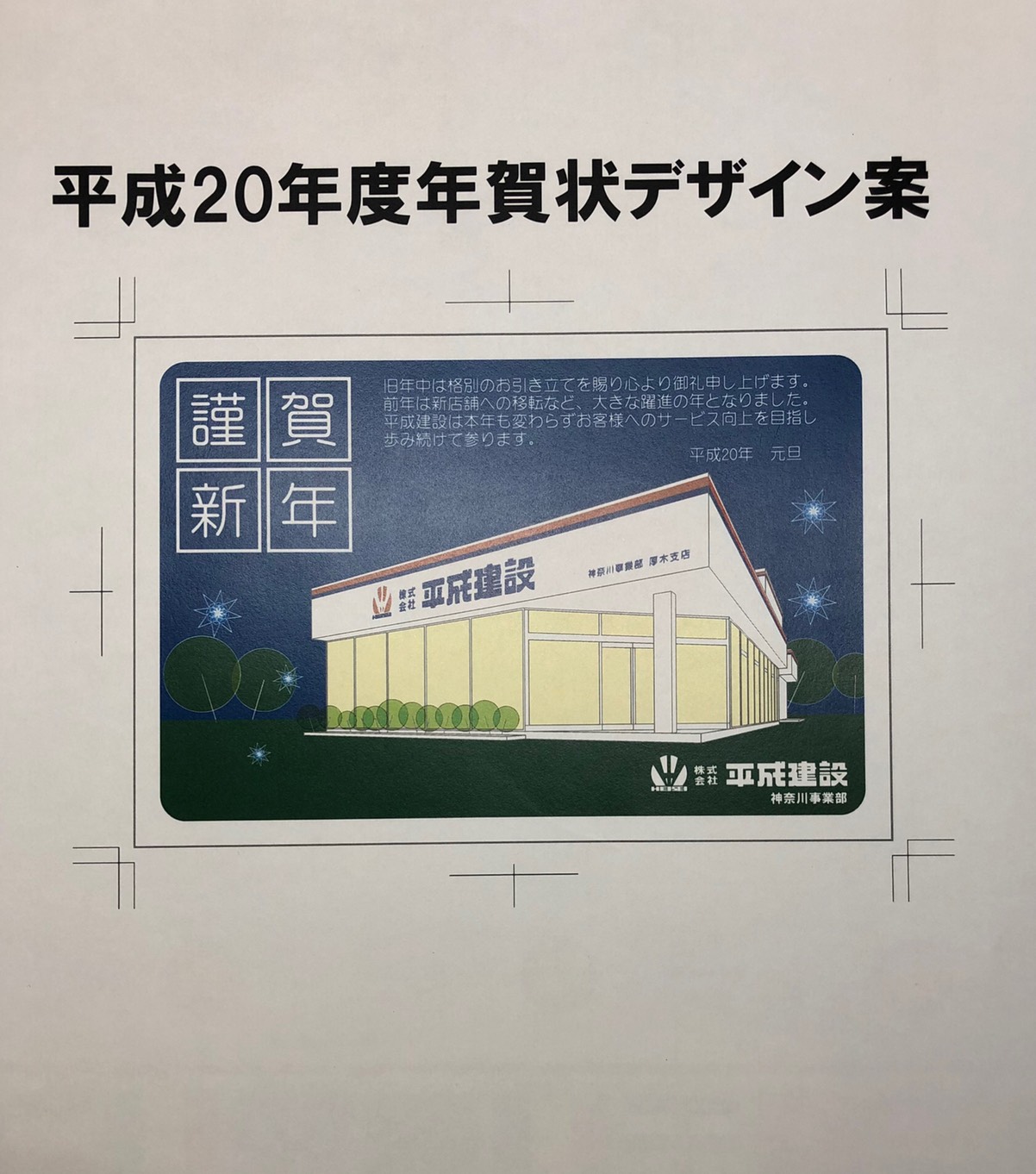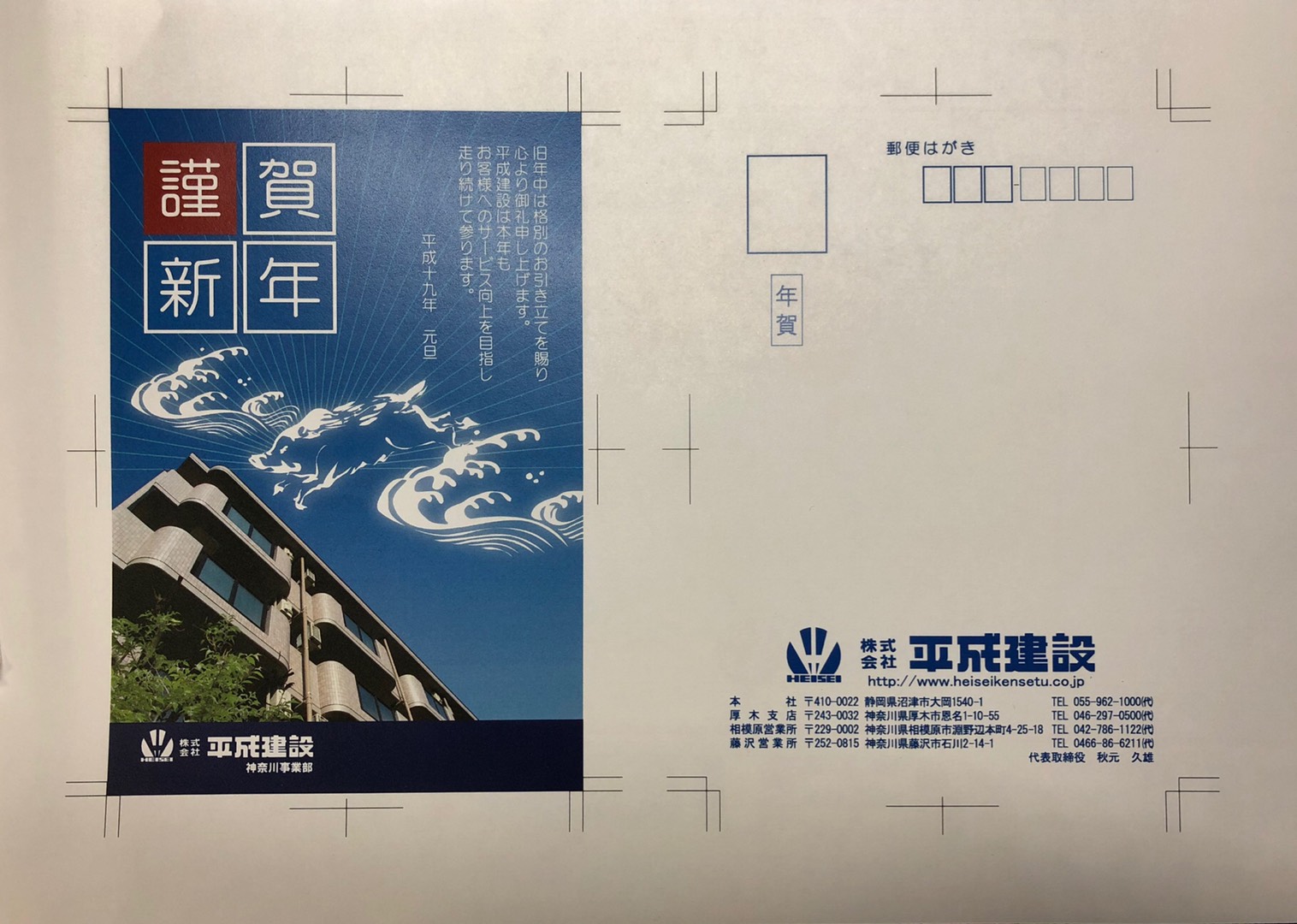 亥年(いのしし年)の年賀状だった為、空を元気よく駆け抜ける猪をイメージしたイラストを作成して自社で建設した物件の写真に組み合わせた。放射状の線は日の出を表し、猪の躍動感を際立たせる為に波しぶきを加えた。