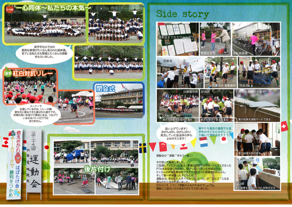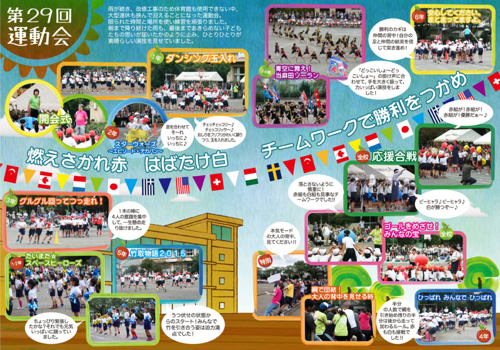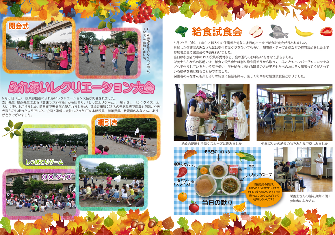 運動会の時期に発行した広報誌だった為、秋をイメージさせるモチーフのイラストを随所に配置した。