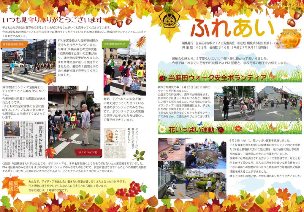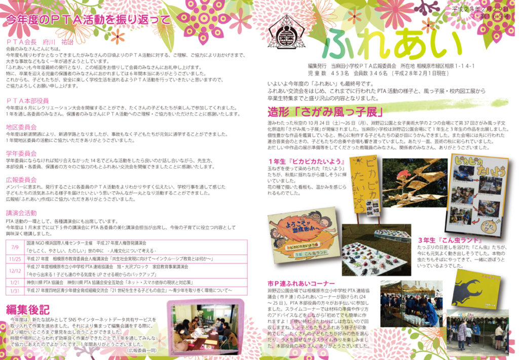 10月~11月に行われた相模原市主催の屋外美術展やPTA主催の交流会(作品展示会)、校内図工展などのイベントの記事を掲載した。年度の最終号にあたる号なので卒業生の自筆メッセージを人数分掲載した。